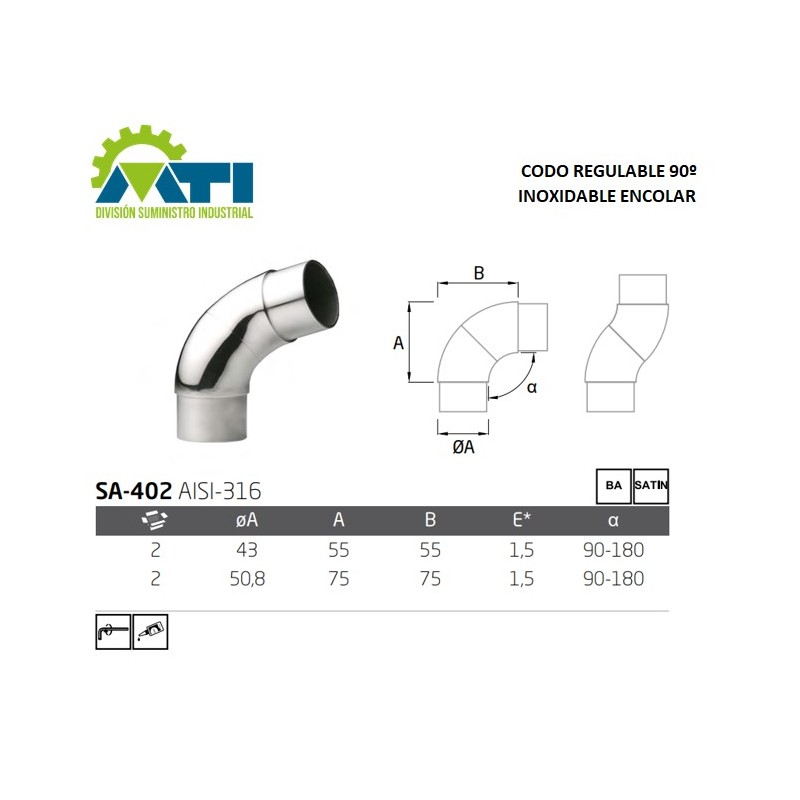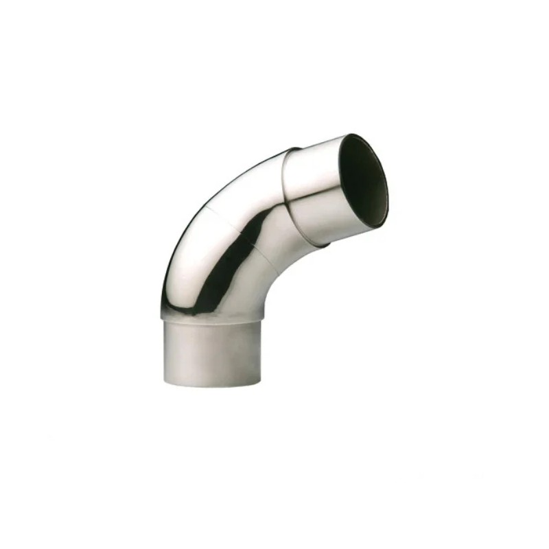 Codo regulable inoxidable a 90º para encolar , en stock en acabado pulido brillo y disponible bajo pedido en acabado satinado , de fácil instalación , sin necesidad de soldaduras al quedar ajustado al tubo por su guía interior, permite unir los tubos a 90º sin prácticamente mostrar la unión logrando una estética perfecta y sin necesidad de soldaduras , la peculiaridad de este codo es que es móvil y permite girar determinados grados en el montaje